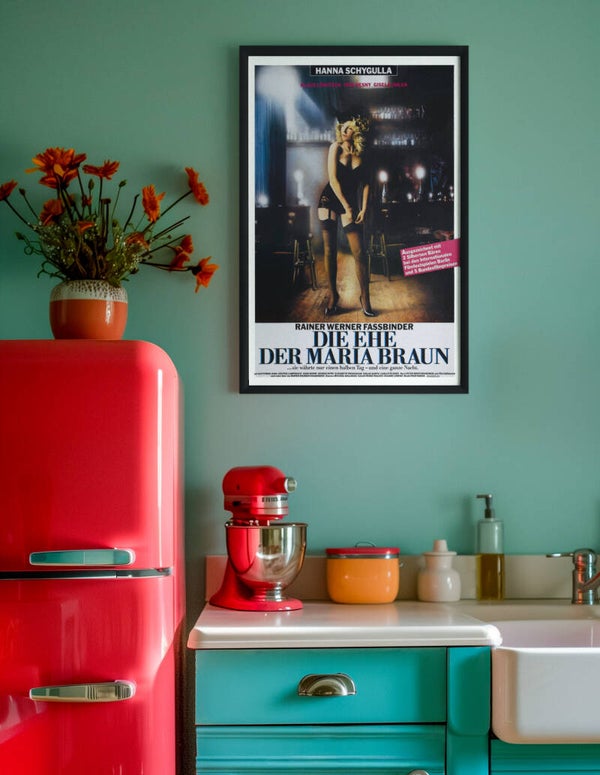 Immerse yourself in the golden age of German cinema with this striking movie poster print from Rainer Werner Fassbinder's acclaimed film 'The Marriage of Maria Braun'. This atmospheric artwork captures the noir-influenced visual style that made New German Cinema revolutionary. The moody composition features dramatic lighting and a cabaret setting that perfectly encapsulates the film's post-war narrative. Originally released in 1979, this film garnered international acclaim, winning multiple Silver Bears at the Berlin Film Festival. This high-quality print lets you bring a piece of influential cinema history to your walls. The poster's vintage aesthetic, with its bold typography and artful photography, makes it an excellent choice for film buffs, art lovers, or anyone looking to add dramatic flair to their decor. This USA-made print preserves all the details of the original German theatrical release poster, from the atmospheric lighting to the distinctive title treatment.
