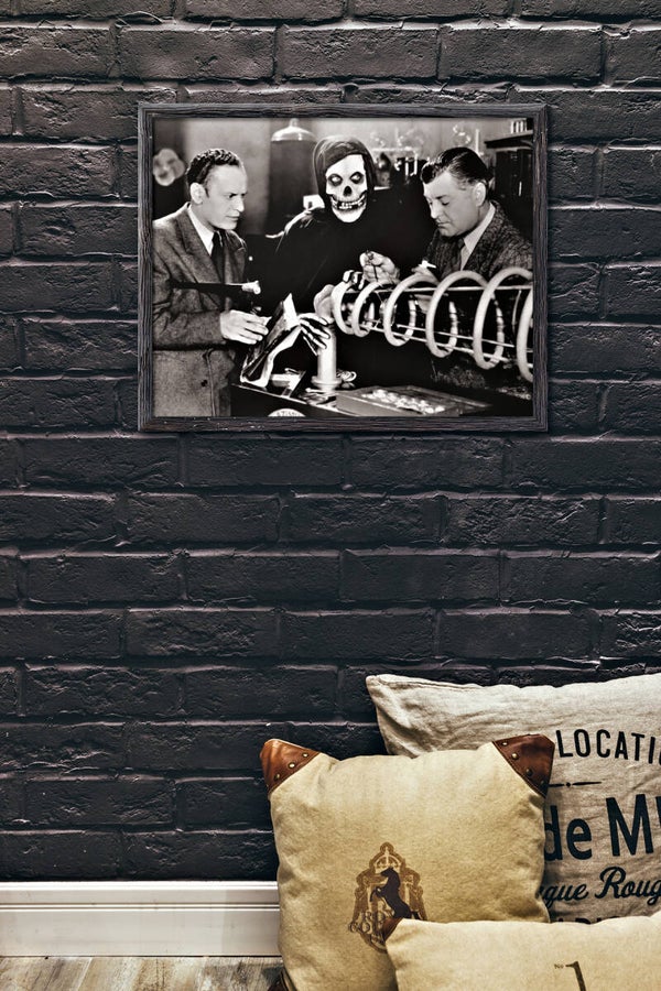 Step into the haunting world of classic horror with this striking 8.5" x 11" art print featuring an iconic still from 'The Crimson Ghost' serial. This black and white print captures the eerie atmosphere of vintage Gothic cinema, showcasing the memorable scene with the mysterious skull-masked figure that has become a symbol of classic horror. The high-quality reproduction preserves every shadowy detail of this atmospheric moment, making it perfect for film buffs, horror enthusiasts, and vintage cinema collectors. Printed in the USA, this art print serves as both a piece of cinema history and a striking decorative element that adds a touch of classic horror aesthetic to any room. The stark contrast and vintage quality make it an eye-catching addition to your wall art collection, ideal for creating a conversation piece or completing a classic horror-themed display.