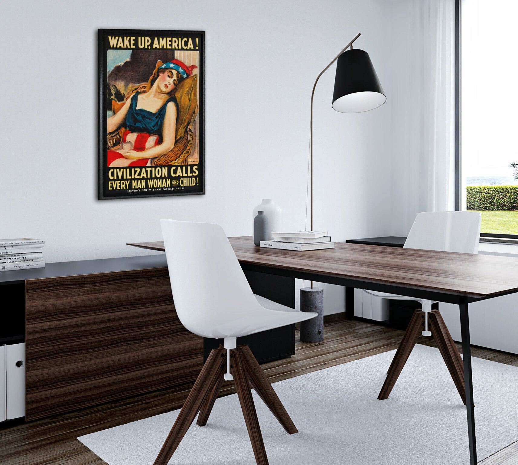 This striking vintage poster print from Archive Cinema captures a powerful piece of American history with its reproduction of World War I propaganda art. The 'Wake Up America! Civilization Calls' design features the iconic imagery of Lady Liberty in patriotic red, white, and blue, symbolizing the call to action during a pivotal moment in history. This historical war propaganda art showcases the bold graphic style and compelling messaging characteristic of early 20th-century poster design. Perfect for history enthusiasts, collectors of Americana, educators, or anyone who appreciates vintage patriotic artwork, this print brings a piece of the past into your home, office, or classroom. The dramatic composition and vivid colors make it an eye-catching addition to any wall, serving as both decoration and conversation starter. Whether you're creating a gallery wall of historical prints or seeking a meaningful piece that reflects American heritage, this reproduction offers an authentic glimpse into the visual culture of wartime America.