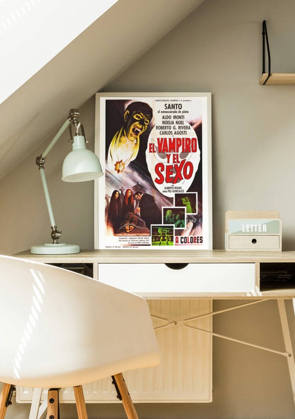 Step into the golden ring of vintage Mexican cinema with this striking 11" x 17" art print featuring the iconic poster from 'Santo and the Treasure of Dracula' (El Vampiro y El Sexo). This rare piece of Lucha Libre history showcases the dramatic artwork from the classic Mexican horror film, featuring the legendary masked wrestler Santo in a supernatural confrontation. The premium glossy poster's bold design combines intense yellows and reds with atmospheric dark tones, capturing the film's unique blend of wrestling action, horror, and drama. Printed in the USA with premium quality materials, this Archive Cinema collector's piece makes a distinctive addition to any film buff's wall art collection or home theater décor. The vintage-style poster perfectly preserves the aesthetic of Mexico's classic cinema era while offering modern print quality. Perfect for fans of cult cinema, wrestling history, or vintage poster art enthusiasts.