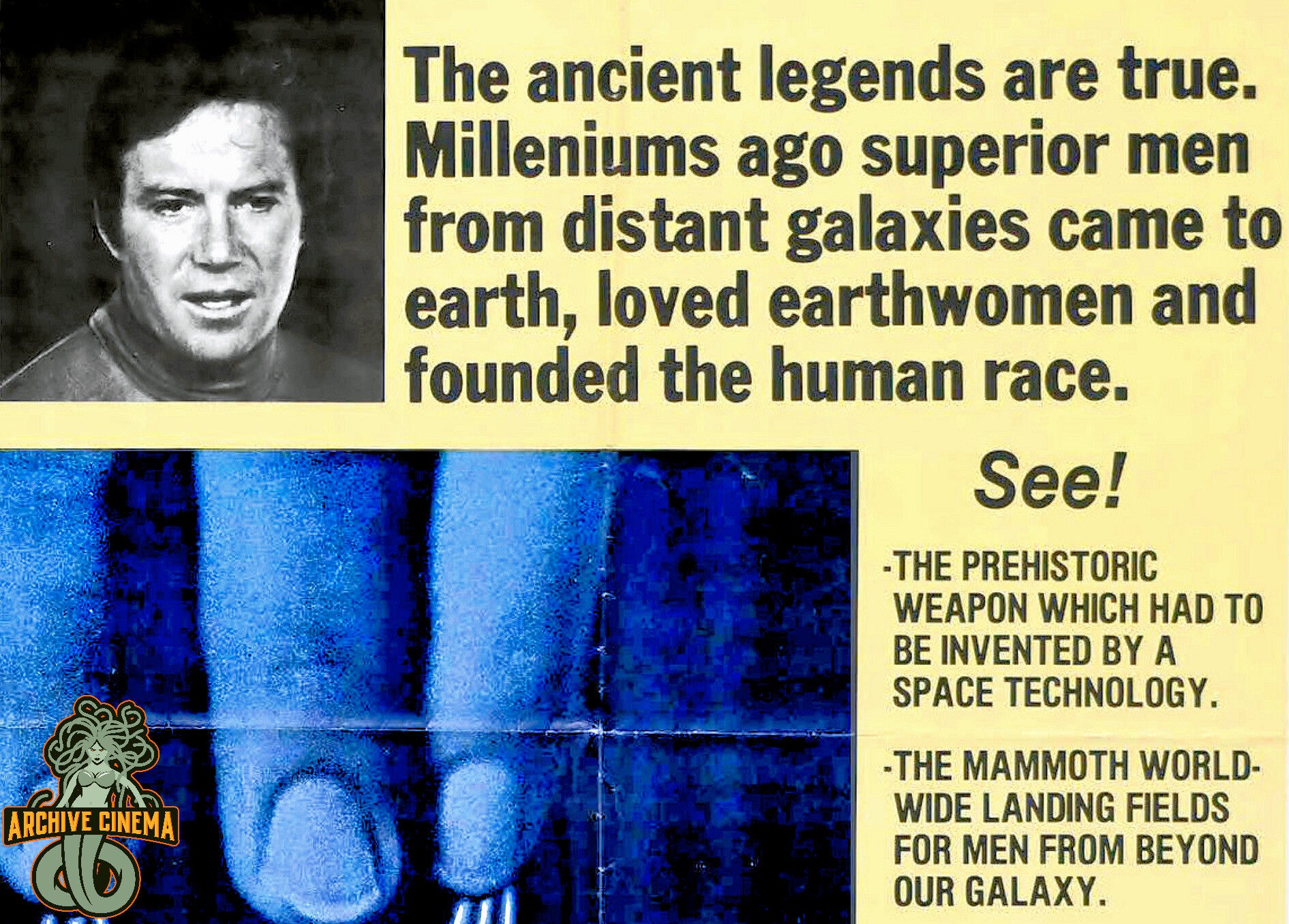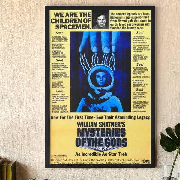 Host William Shatner is your congenial host into the fascinating world of ancient astronaut theory with this premium glossy 11"x17" Archive Cinema poster print of the 1976 documentary 'Mysteries of the Gods.' Captivating wall art poster showcases the classic film that explores intriguing theories about extraterrestrial visitors and their potential influence on ancient civilizations. The mysterious phenomena investigated in the film ranges from crystal skulls to prehistoric technology. Based on Erich von Daniken's best-selling work.