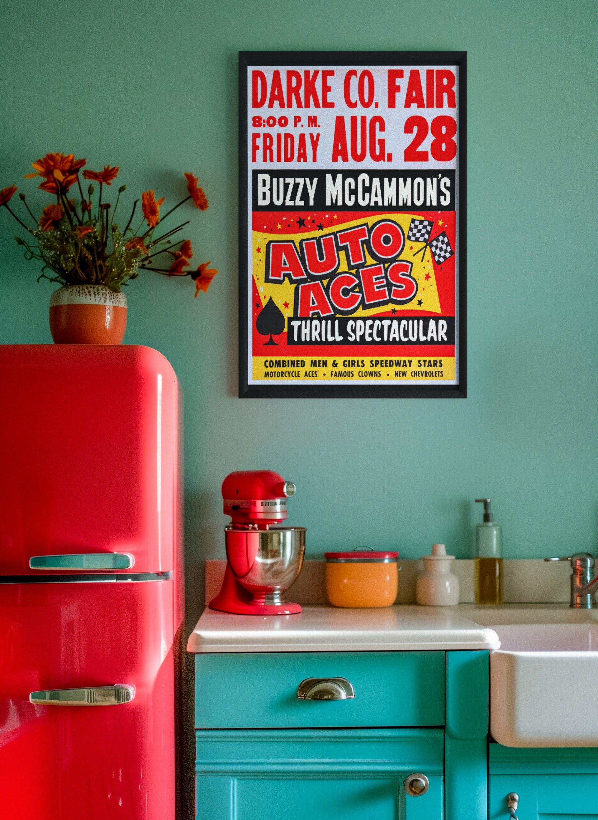 - VINTAGE RACING POSTER: Archive Cinema reproduction of a classic Darke County Fair event poster featuring Buzzy McCammon's Auto Aces Thrill Spectacular from Friday, August 28